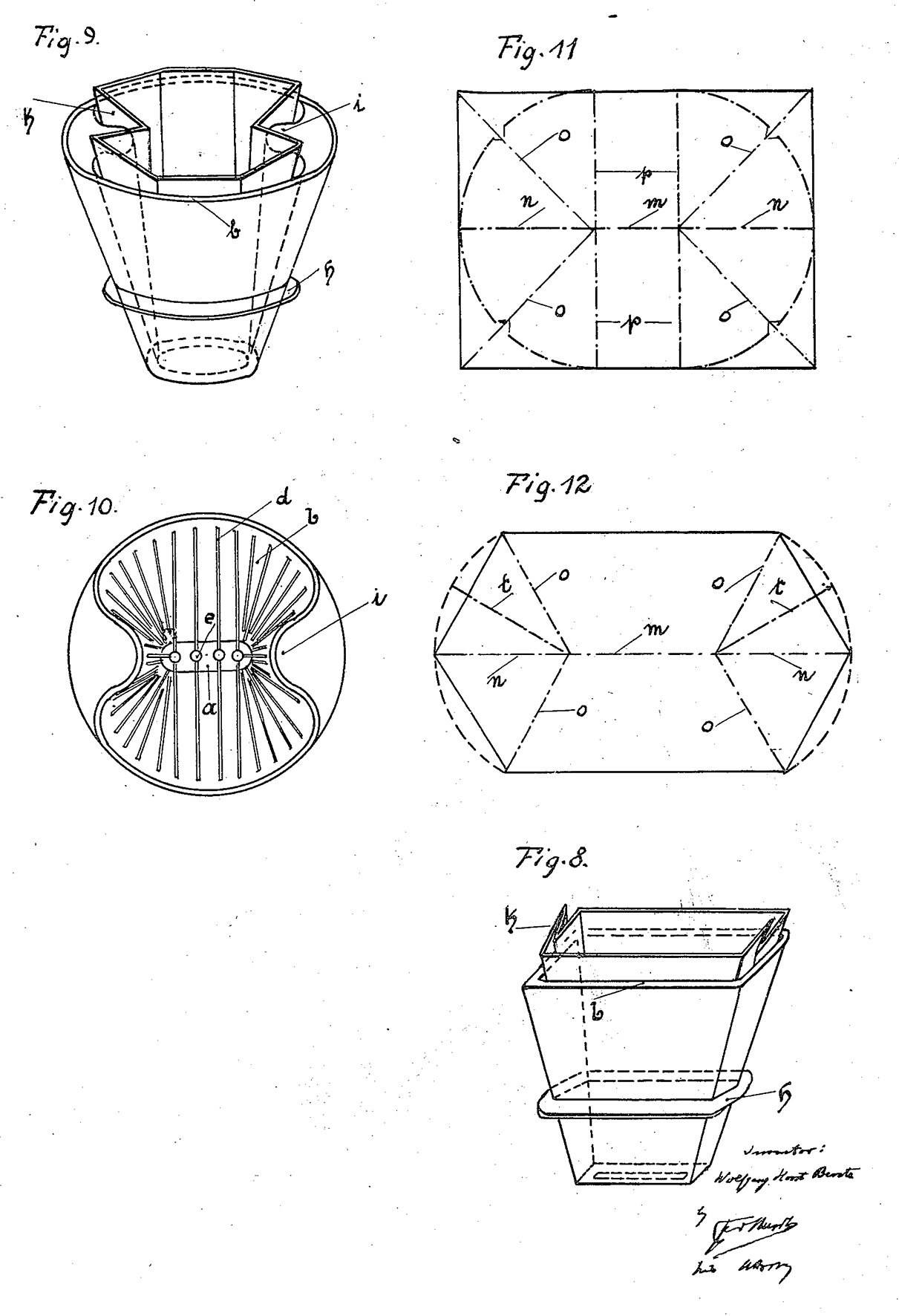 Nel 1935 depositò nel Regno Unito il brevetto GB451197A (concesso nel 1936) che descriveva un filtro preformato, sagomato in modo tale da aderire perfettamente alle pareti del contenitore spesso dotate di nervature interne (qui il link per visualizzarlo). Il problema affrontato era tecnico: l’accartocciamento involontario della carta contro le pareti generava spessori doppi che ostacolavano il flusso dell’acqua e la soluzione fu quella di progettare pieghe predefinite che si adattassero ai rilievi evitando sovrapposizioni accidentali. Le parole del brevetto parlano di “crimped, shaped, stitched or embossed sidewalls” e disegnano un oggetto che non è più improvvisato ma pensato in ogni sua piega.